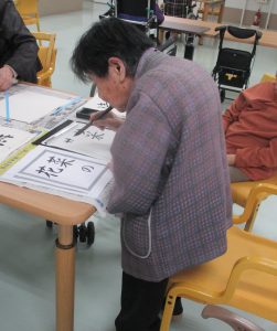真剣な顔でお手本をじっくり見ながら書く方、